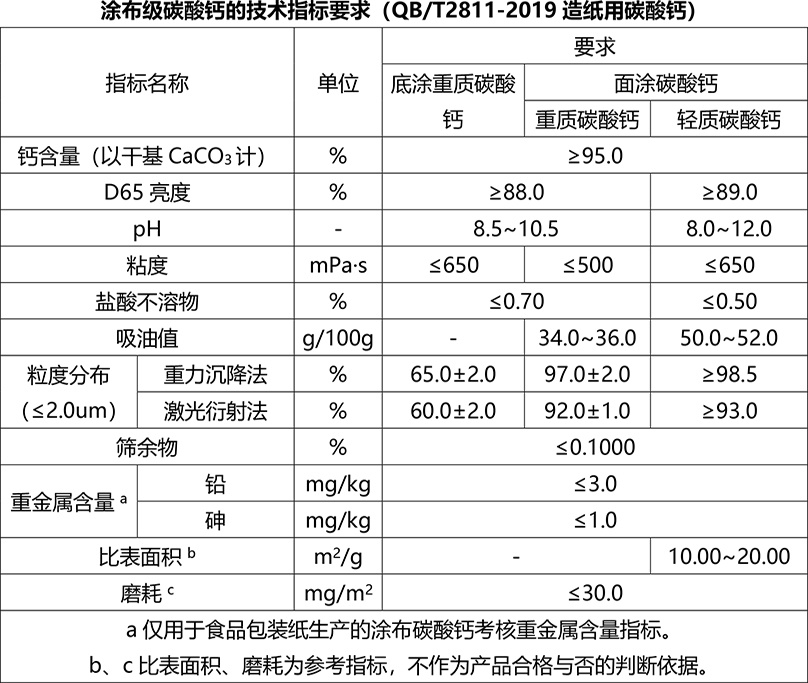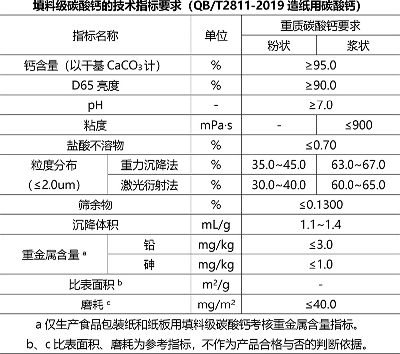 2020年4月1日,QB/T2811-2019造纸用碳酸钙代替QB/T2811-2006造纸研磨碳酸钙正式实施。依据标准,造纸用碳酸钙按产品用途分为填料级碳酸钙、涂布级碳酸钙。其中填料级碳酸钙包括重质碳酸钙(研磨碳酸钙)和轻质碳酸钙(沉淀碳酸钙),涂布级碳酸钙包括底涂碳酸钙和面涂碳酸钙。